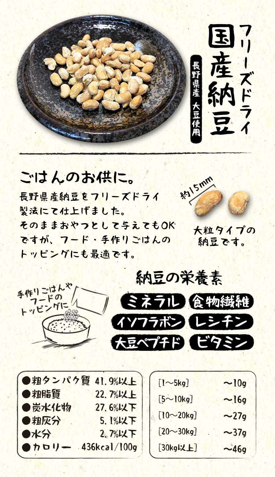長野県産納豆をフリーズドライ製法にて仕上げました。 血液サラサラ効果!血栓予防にもおすすめです。高血圧や高齢のワンちゃんにもぴったり!!
