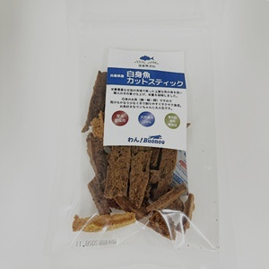 北海道産のサーモンの皮、骨、身、内臓をミンチ後、ダイス状に形成、カリカリとした食感です。お魚好きの子に人気です。