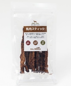 【わん!Buono】馬肉スティック 50g¥840(税込)高タンパクで低カロリー、鉄分やビタミンB群などが豊富に含まれるお肉スティック状に成型し、じっくり低温乾燥にて仕上げてます