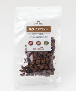 【わん!Buono】馬ダイスカット 50g¥860(税込)高タンパクで低カロリー、鉄分やビタミンB群などが豊富に含まれるお肉1センチ前後のキューブ状なので、しつけや訓練のご褒美にぴったり!