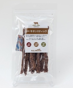 【わん!Buono】牛タンスティック 50g¥640(税込)タンパク質、脂質、鉄分特にビタミンB群に含まれる栄養素が豊富です。牛タン皮をMIXして、スティック状に成型しました