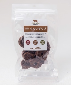 【わん!Buono】牛タンチップ 50g¥640(税込)タンパク質、脂質、鉄分特にビタミンB群に含まれる栄養素が豊富です。牛タン皮をMIXして、 直径は3~4センチぐらいに成形しました