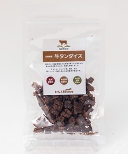 【わん!Buono】牛タンダイス 50g¥620(税込)タンパク質、脂質、鉄分特にビタミンB群に含まれる栄養素が豊富です。1センチ前後のキューブ状なので、しつけや訓練のご褒美にぴったり!