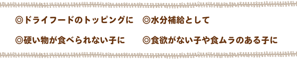 ドライフードにトッピングして頂く使い方もおすすめしております。その際の給与量の算出の仕方は下記に明記しております。