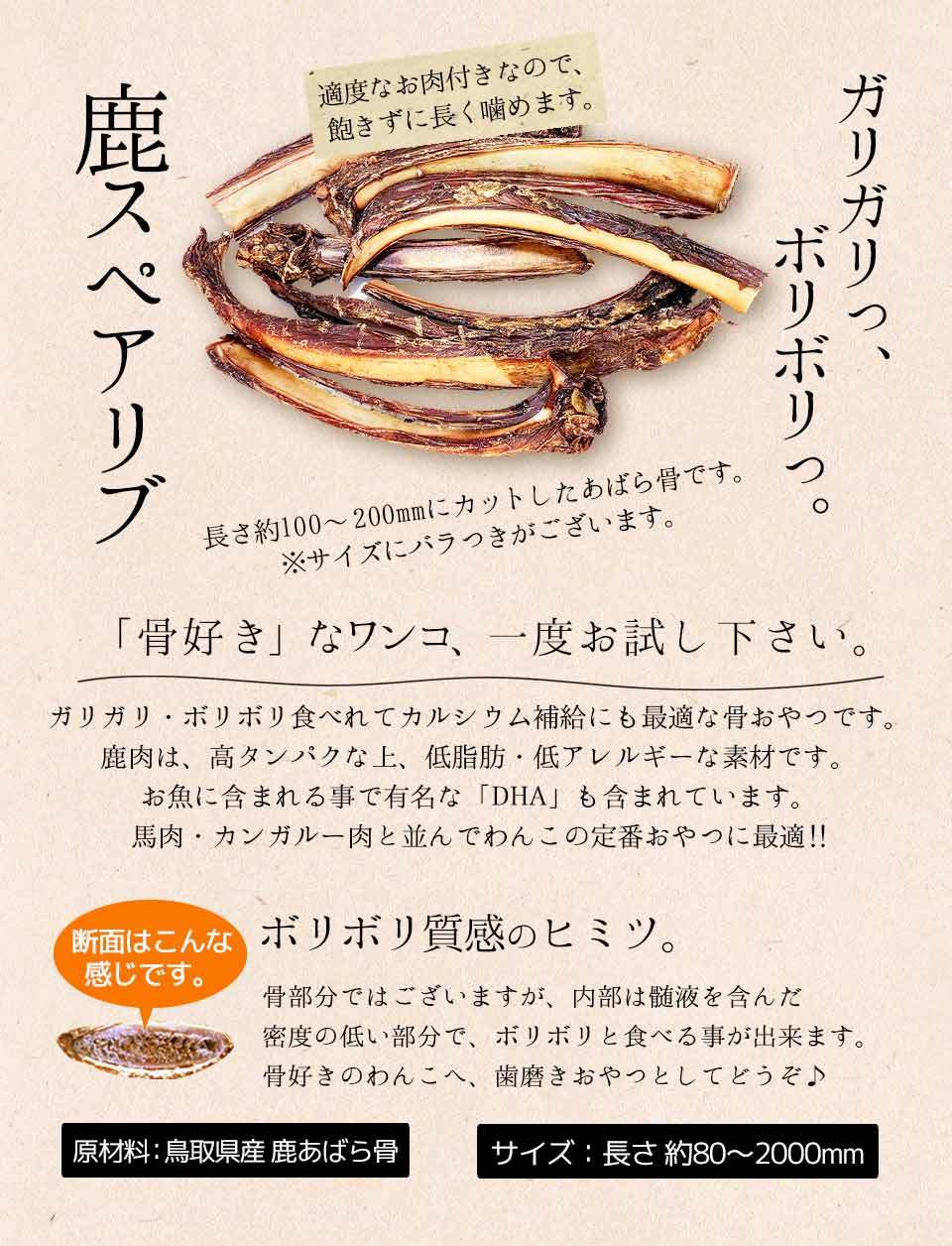 鹿のあばら骨を乾燥させた歯磨きおやつです。 うっすらお肉付きでガリガリと飽きずに噛める骨おやつ。