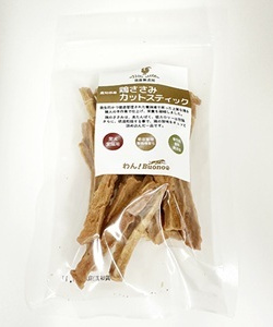【わん!Buono】エイ丸ごとカットスティック 50g¥800(税込)タンパク質やビタミン B 群が豊富です。骨やヒレもまるごと粗びきにして、スティック状にしました。ヒレのコラーゲン成分を摂取できます。