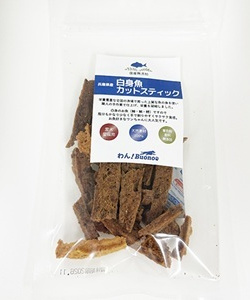 【わん!Buono】白身魚カットスティック 50g¥640(税込)白身魚の鰆・鯛・鱈をスティック状に乾燥処理してジャーキーを作りました。白身の魚ですので、脂分もなく手で割りやすいです。